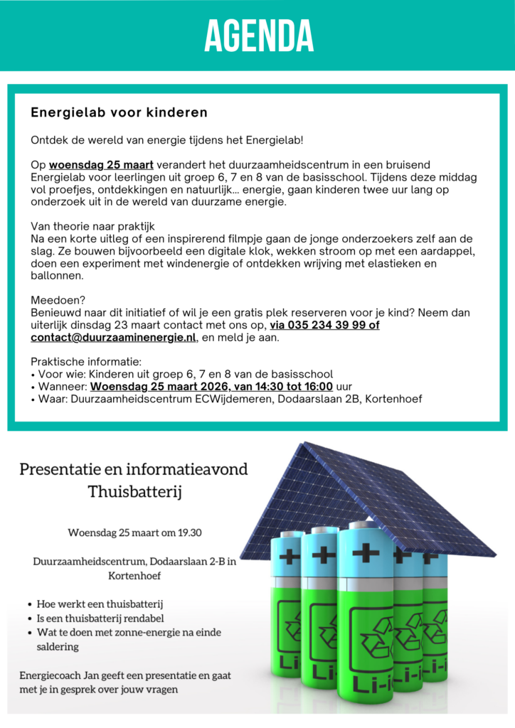 We nodigen je niet alleen uit, maar komen ook naar je toe. De Energiecoöperatie Wijdemeren werkt door bewoners voor elkaar. Daarbij horen ook onze huis-aan-huis-acties waarin we je informeren over mogelijkheden die er zijn om aan de slag te gaan met het verduurzamen van de woning of het gebruiken van energie. Lees verder