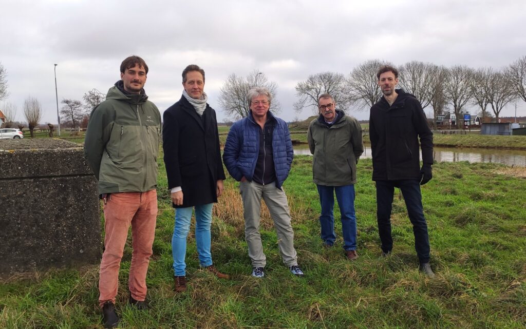v.l.n.r.: Merlijn van Selm Waterschap AGV, Jeroen Kerkvliet Projectleider Blijkpolder ECWijdemeren, Nanno Bouma coördinator bewonersgroep Blijkpolder ECWijdemeren, Piet van Gelder lid bewonersgroep Blijkpolder en Harry de Brauw Waterschap AGV