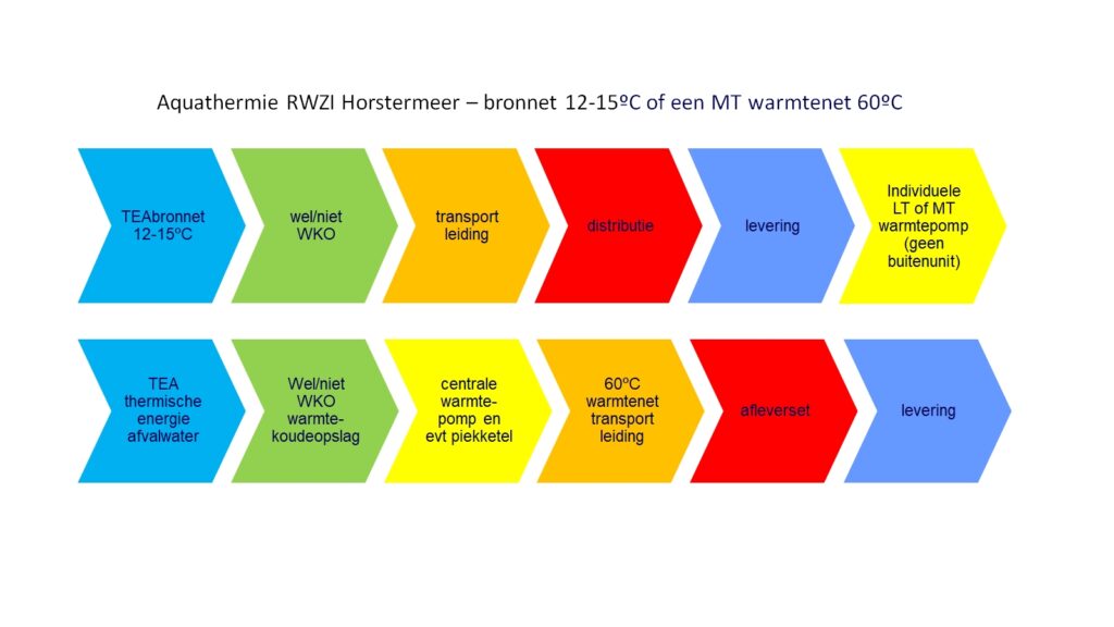 Voorjaar 2023 presenteren we de uitkomsten van de haalbaarheidsstudies. Uit de quickscans en de haalbaarheidsstudies komt naar voren dat Nieuw-Loosdrecht ondanks al het water niet geschikt is voor aquathermie. De bronnen liggen voor Nieuw-Loosdrecht te ver weg van de wijken. Voor de andere drie dorpen is aquathermie van afvalwater een stabiele warmtebron met zomers en ’s winters bijna dezelfde temperatuur van 12-15°C . Ankeveen ligt naast de rioolwaterzuivering (RWZI) Horstermeer. Er loopt een persleiding met gezuiverd afvalwater van de RWZI langs Nederhorst den Berg naar de Vecht. En er loopt een persleiding met ongezuiverd afvalwater langs Kortenhoef naar de RWZI Horstermeer. Er volgt nog een extra onderzoek naar het gebruik van ongezuiverd afvalwater.